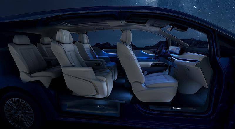 從官圖來看,新車內飾的顏色搭配與世紀同步,寶藍色+米白色的組合確實能帶來很不錯的高級感。另外,中控臺上氛圍燈布局得恰到好處,而門框以及座椅底下也有腳步照明燈。新車將會提供6座和7座可選,其中6座版本的第三排依舊為兩張獨立的座椅,這一點值得點贊,而7座版本的第三排則支持電動翻折功能。