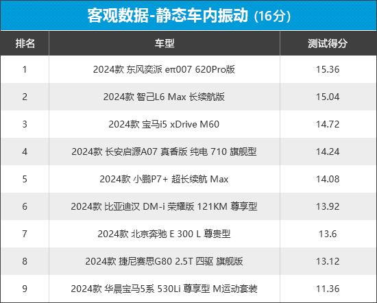 從榜單排名來(lái)看,東風(fēng)奕派eπ007表現(xiàn)最佳,可見(jiàn)其非常注重車內(nèi)駕乘人員的舒適性體驗(yàn)。值得注意的是,華晨寶馬5系在該測(cè)試環(huán)節(jié)再次敗北,其中方向盤和前排座椅在負(fù)載狀態(tài)下的振動(dòng)數(shù)值增幅較大,但好在實(shí)際體感不太明顯。