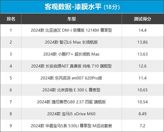 從榜單中可以看出,比亞迪漢在此環(huán)節(jié)得分最高,整車漆膜厚度和噴涂均勻性表現(xiàn)較為出色。而來(lái)自傳統(tǒng)豪華品牌的華晨寶馬5系排名墊底,得分僅為7.2分,主要原因在于全車漆膜厚度均值偏低,影響了整體得分。