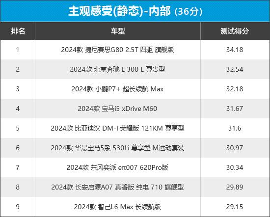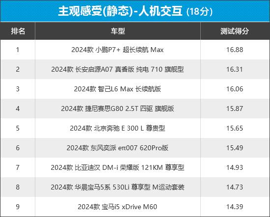 從榜單中不難看出,捷尼賽思G80繼續(xù)保持著較高的水準(zhǔn),在該環(huán)節(jié)表現(xiàn)突出,與其豪華品牌車型的定位相吻合,排名領(lǐng)跑其他8款車型。相比之下,智己L6在該環(huán)節(jié)得分最低,這與其第二排座椅舒適性不高有關(guān),導(dǎo)致失分。