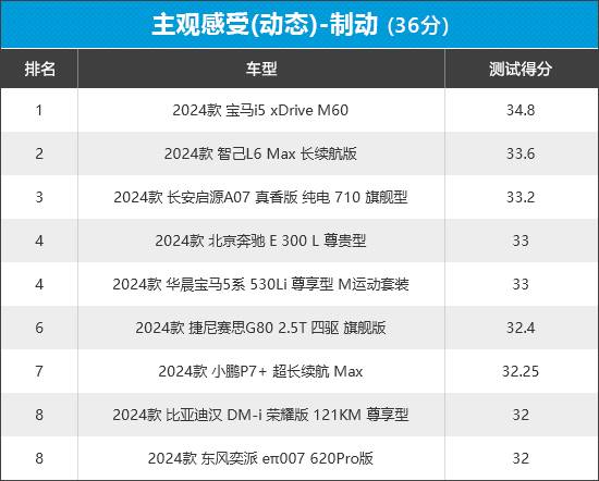 從榜單排名情況來(lái)看,寶馬i5獲得第一名,在制動(dòng)踏板腳感、能量回收等方面得到了滿分成績(jī)。比亞迪漢和東風(fēng)奕派eπ007由于在體驗(yàn)過(guò)程中發(fā)現(xiàn)制動(dòng)腳感表現(xiàn)一般,拉低了整體得分。