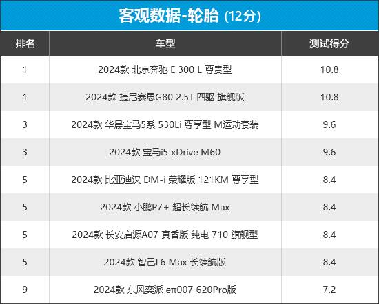 從榜單排名來(lái)看,北京奔馳E300L和捷尼賽思G80得分最高,均為10.8分,寶馬的兩款車型緊隨其后,符合其豪華品牌定位。相比之下,東風(fēng)奕派eπ007表現(xiàn)墊底,輪胎單價(jià)為600元左右。