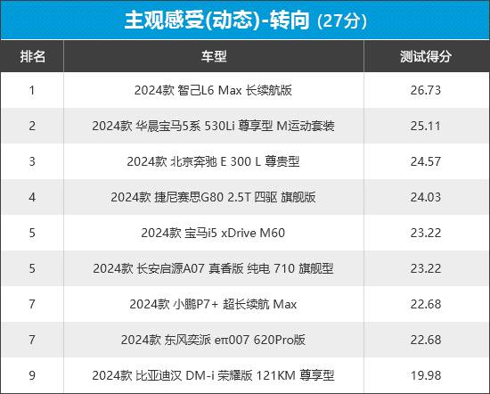 從榜單排名情況來(lái)看,智己L6斬獲榜單冠軍,其在7項(xiàng)測(cè)試中有6項(xiàng)拿到了滿分,整體表現(xiàn)可圈可點(diǎn)。相比之下,比亞迪漢在該測(cè)試環(huán)節(jié)表現(xiàn)一般,由于轉(zhuǎn)彎半徑較大導(dǎo)致得分被拉低。