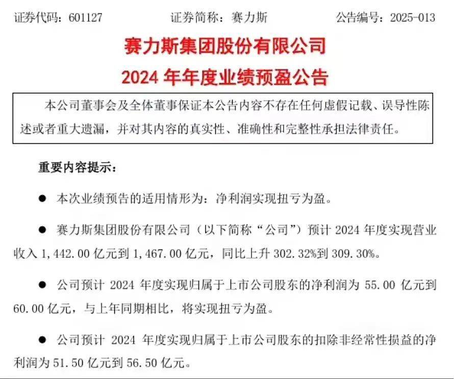 日前,賽力斯發布公告,預計2024年度實現營業收入1442億元到1467億元,同比上升302.32%到309.30%。預計2024年度實現歸屬于上市公司股東的凈利潤55億元到60億元,同比扭虧為盈。賽力斯2023年度歸屬于上市公司股東的凈利潤為-24.50億元,2024年實現凈利潤轉正。