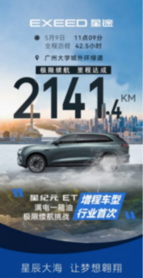 星途星紀元ET黃金增程突破2141km 刷新中國新能源車續航新紀錄