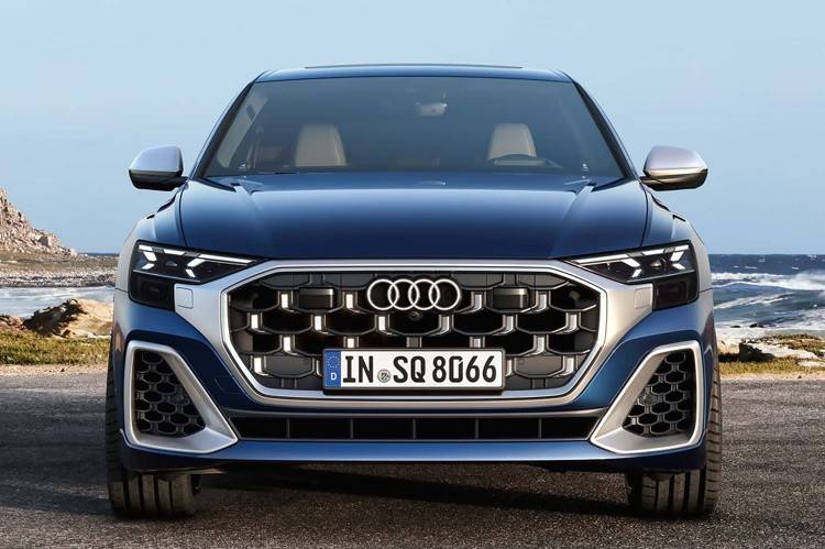 現款奧迪Q8是大改款版本,前臉大尺寸進氣格柵內加入半縷空效果的熏黑網格,外側跟導流槽部分也進行黑化。前大燈有著倒L效果。