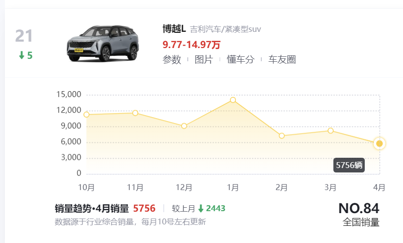 從銷量來看,吉利博越L4月份售出5756輛,在緊湊型SUV里,排在第21名。競品車型包括比亞迪宋Pro DM-i、哈弗H6、長安CS75 PLUS、鋒蘭達等。