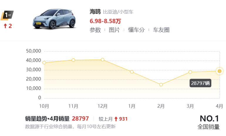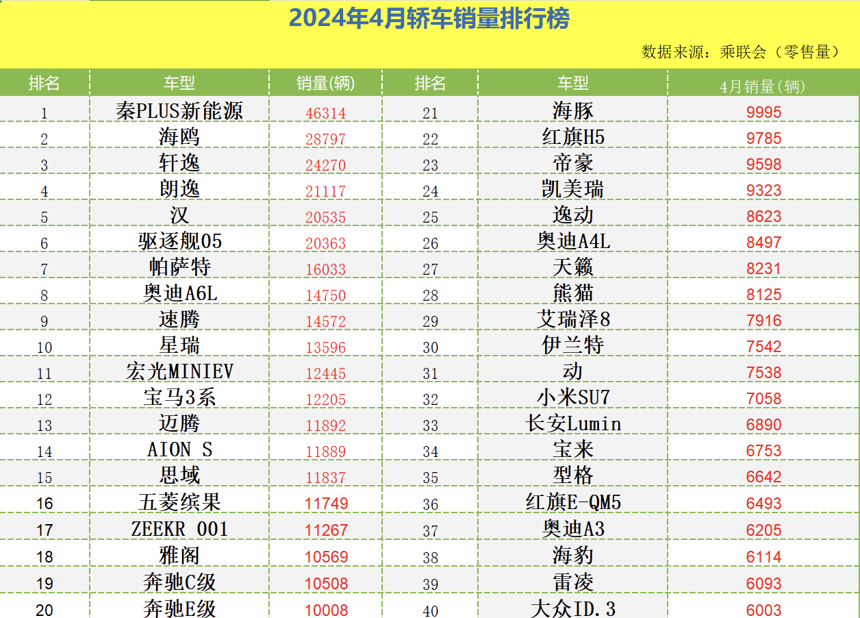 首先,位列銷量排行榜榜首的是秦PLUS,其零售量為46314輛,表現相當強勢,這表明這款產品受到消費者廣泛認可和喜愛。緊隨其后的是海鷗,零售量為28797輛,相比上個月(3月份轎車)零售量上漲931輛,表現呈平穩趨勢!第三名到第十名的車型分別是朗逸、漢、驅逐艦05、帕薩特、奧迪A6L、速騰、星瑞,這幾款車型的零售量上下浮動不大,給人的感覺銷量比較扎實。