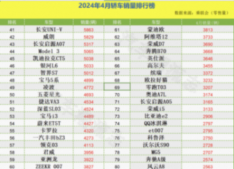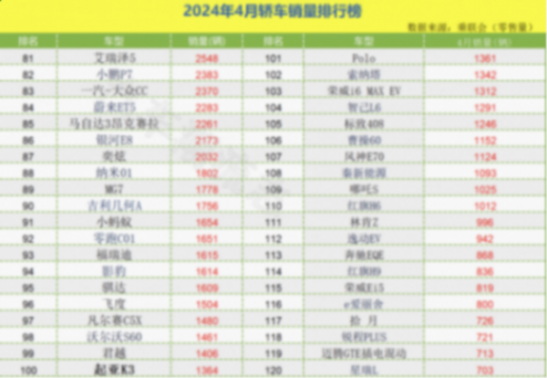 41-120名之中,排在41-47名里的車型都突破了5千輛,其中長安啟源A07、銀河L6的銷量上漲明顯。而Model 3、凱迪拉克CT5等車型則呈下滑趨勢,尤其是Model 3相比上個月(3月份轎車)零售量下滑9416輛,比較慘淡。之后就不一一闡述了直接看圖!