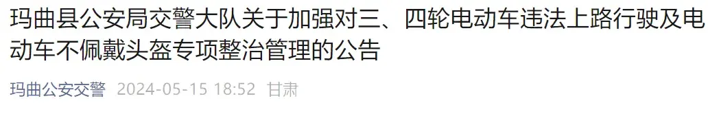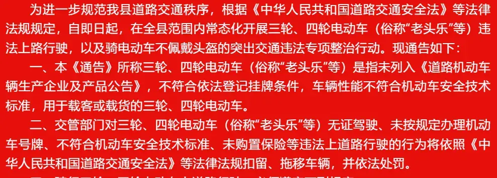 目前全國多地都對三四輪車上路提出了更為嚴厲的標準,我們就以甘肅瑪曲縣近日發(fā)布的公告為例,即日起要在全縣范圍內(nèi)常態(tài)化開展電動三、四輪車違法上路行駛專項整治行動。當中提到交管部門會對三、四輪車無證駕駛、未按照規(guī)定辦理機動車號牌,未購置保險等違法上道路行駛行為,采取扣留、拖移車輛的處理。