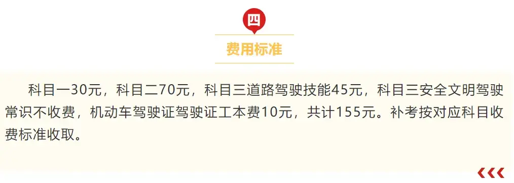 關于收費這方面,其實各地標準并不統一,不過金額相差也不會太多,以江蘇丹陽為例,四項考試加上駕駛證工本費,一共在155元,補考按照對應科目的收費標準收取。