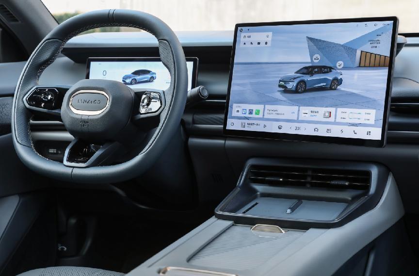 內飾部分有很多元素與領克08 EM-P類似,平鋪式的中控臺面和貫穿式空調出風口,上方配備12.3英寸全液晶儀表盤和15.4英寸懸浮式中控屏幕,搭配92英寸AR-HUD抬頭顯示,組成三屏系統。LYNK Flyme Auto魅族車機系統也沒有落下,UI界面簡潔自然,交互邏輯清晰易懂。