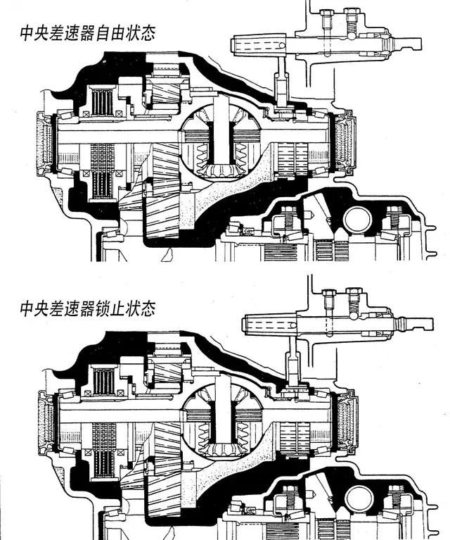 而電控差速鎖則由分別與前、后軸相連的兩個直齒齒輪,以及撥叉、同步器、電動機和傳動機構等組成;在車內按下電控開關后,電動機便會驅動傳動機構,使撥叉帶動同步器軸向滑動,將前后軸直齒齒輪相連,達成中央鎖止目的。
