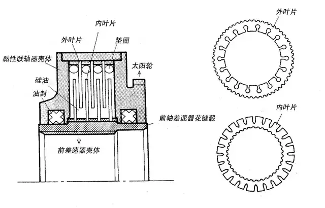 中央差速器的限滑由黏性聯軸器完成,其中外葉片與后軸驅動齒輪相連,內葉片與前軸差速器相連,工作時內部油液由于受熱膨脹,導致聯軸器內部壓力上升,內、外葉片產生摩擦力,實現限滑。