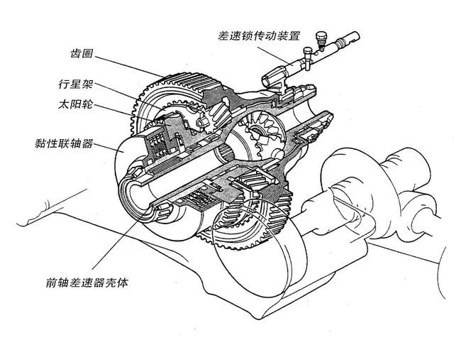 中央差速器采用雙行星齒輪排結構,齒圈連接變速箱輸入動力;行星架連接前軸差速器,傳遞動力到前軸;太陽輪連接后軸取力器,傳遞動力到后軸;行星架上與齒圈相連的為外小行星齒,與太陽輪相連的為內小行星齒,二者負責吸收并分配前后軸動力。此外,前軸差速器嵌入其中,并在兩段串聯黏性聯軸器與電控差速鎖,設計相當緊湊。