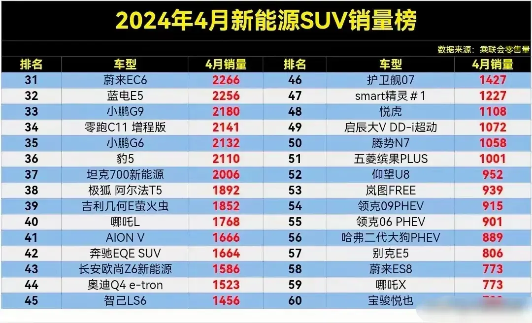 31~60排名,蔚來EC6、藍電E5、小鵬G9、零跑C11增程版、小鵬G6、豹5、坦克700新能源都在2千多左右。極狐阿爾法T5、吉利幾何E螢火蟲、哪吒L、AION V、奔馳EQE SUV、長安歐尚Z6新能源、智己LS6、護衛艦07、悅虎等都超過1千多輛。仰望U8、嵐圖FREE、領克09PHEV、領克06PHEV、哈弗二代大狗PHEV、別克E5、蔚來ES8、哪吒X、寶駿悅也都在700~900多輛。