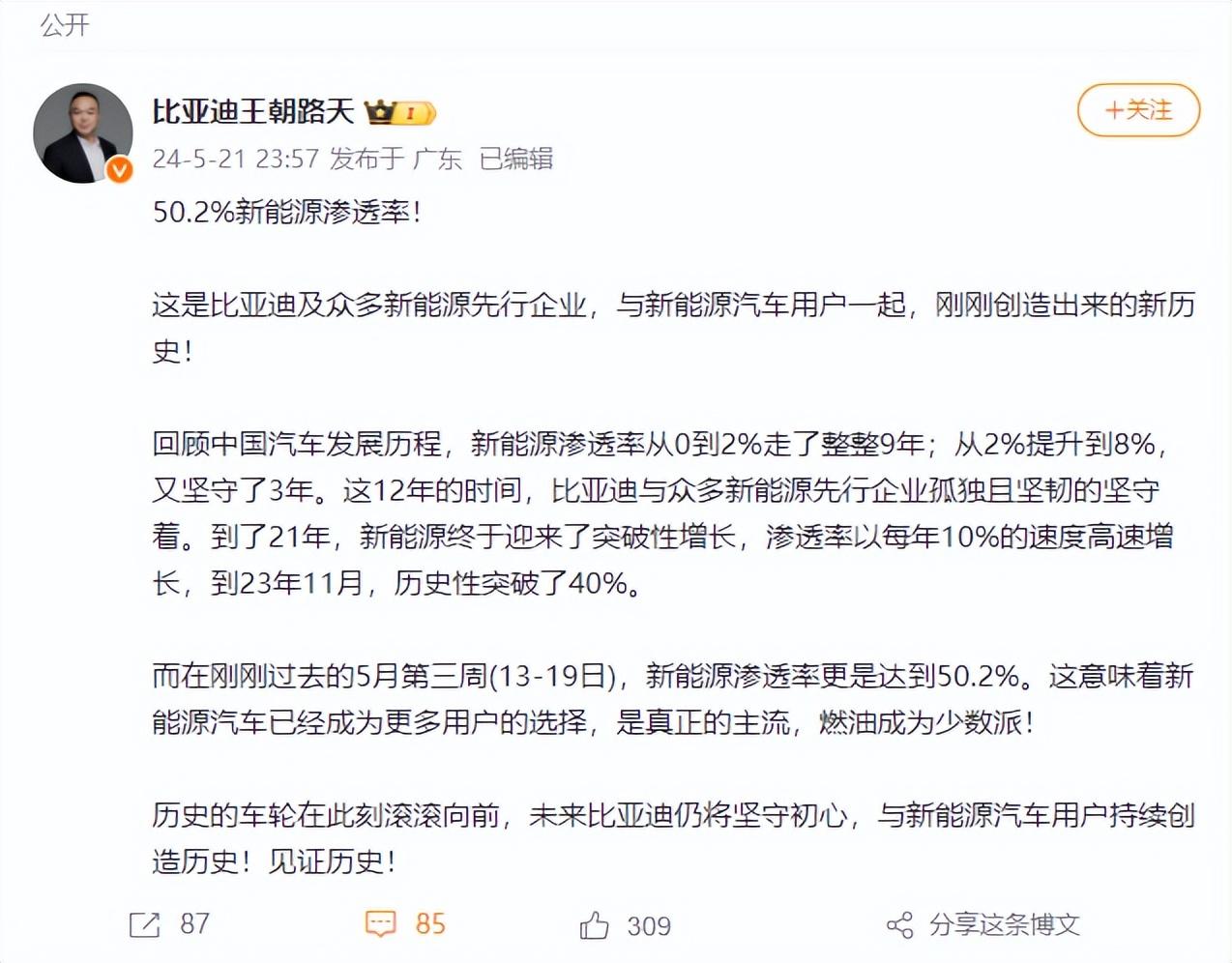 按照乘聯會公布數據,2024年4月上半月,國內新能源車零售滲透率突破50%,而本次5月第三周國內新能源乘用車上險量達到16.8萬輛,新能源終端上險滲透率也首次超過50%。這意味著新能源車型從此刻開始已經有了超越燃油車型的市場份額,算無異于是重大突破,而這項新歷史是由比亞迪和眾多新能源先行企業,以及諸多新能源用戶一起實現。