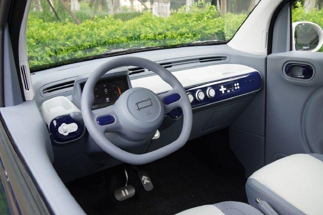 內飾配備雙輻式平底方向盤和7英寸液晶儀表,中控區域保留了大量旋鈕和實體按鍵,比較特別的是收音機的按鍵布局設計成游戲手柄的樣式,電門和剎車踏板上也加入了游戲元素。配置方面,提供車載藍牙、收音機、手動空調、12V電源和遠程控制。App遠程控制包含手機遠程解鎖、遠程閉鎖,一鍵尋車以及閃燈鳴笛。安全配置包括后倒車雷達、主安全氣囊、胎壓報警、上坡輔助、ABS+EBD等。