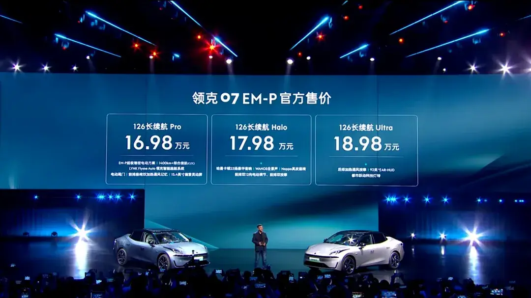 新車推出了三個版本,售價為16.98萬~18.98萬元,疊加限時權(quán)益,領(lǐng)克07 EM-P的起售價下探至16.38萬元,相比此前18萬~21萬元的預(yù)售價降低了2萬元左右。
