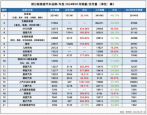 2024年2月1日,國內各車企發布旗下新能源產品1月銷量。在年初周期性因素影響下,包括比亞迪、五菱新能源、理想、蔚來、零跑在內的多個品牌環比均出現大幅下跌。值得注意的是,AITO全系1月交付新車32973輛,首次成為新勢力品牌月銷量冠軍,其中問界新M7單月交付31253輛新車,首次實現單月交付突破30000輛。