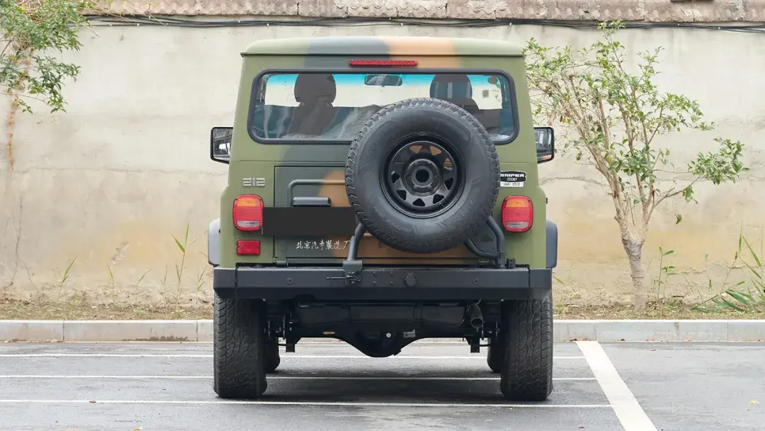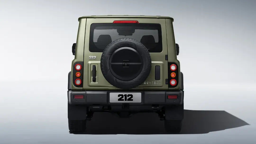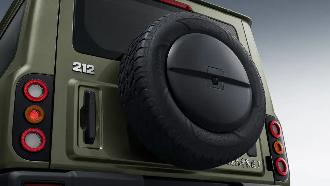 來到車尾,全新212的設計變化就比較大了。原本凸起的尾燈被完全鑲嵌在了車身內,方形的外輪廓也變成了復古范十足的圓燈,外掛的備胎也從偏右側的位置被移動到了中間。尾門的開啟方式也從一半的“天地門”,更改成了相對傳統的側開門,開門方向為從左往右。