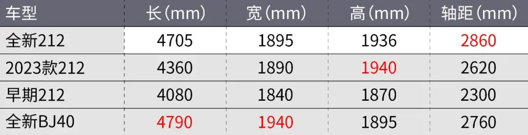 雖然全新212整體的造型沒變,但是為了迎合市場潮流,車輛的尺寸相比起初代車型是有了明顯變化的。車身長度從最初的4米出頭增加到了4.7米的水平,寬度也增加了55mm,軸距也從最早的2300mm進化到了2860mm。因此相比起老212那迷你的身材來說,全新一代212尺寸基本已經摸到了中型SUV的門檻,2860mm的軸距甚至比普拉多、坦克500這種中大型SUV還長。