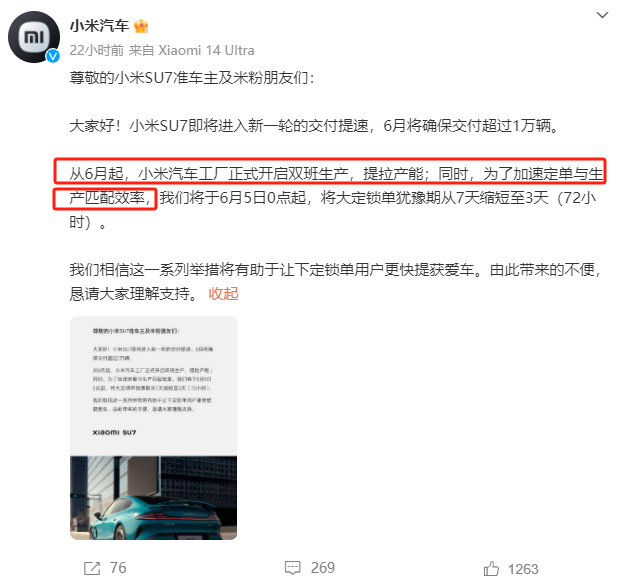 由于產(chǎn)能提升,小米汽車把原先的鎖單猶豫期從7天縮短到3天。對于米粉來說,想好了就買,一天都不想等,還猶豫啥?!