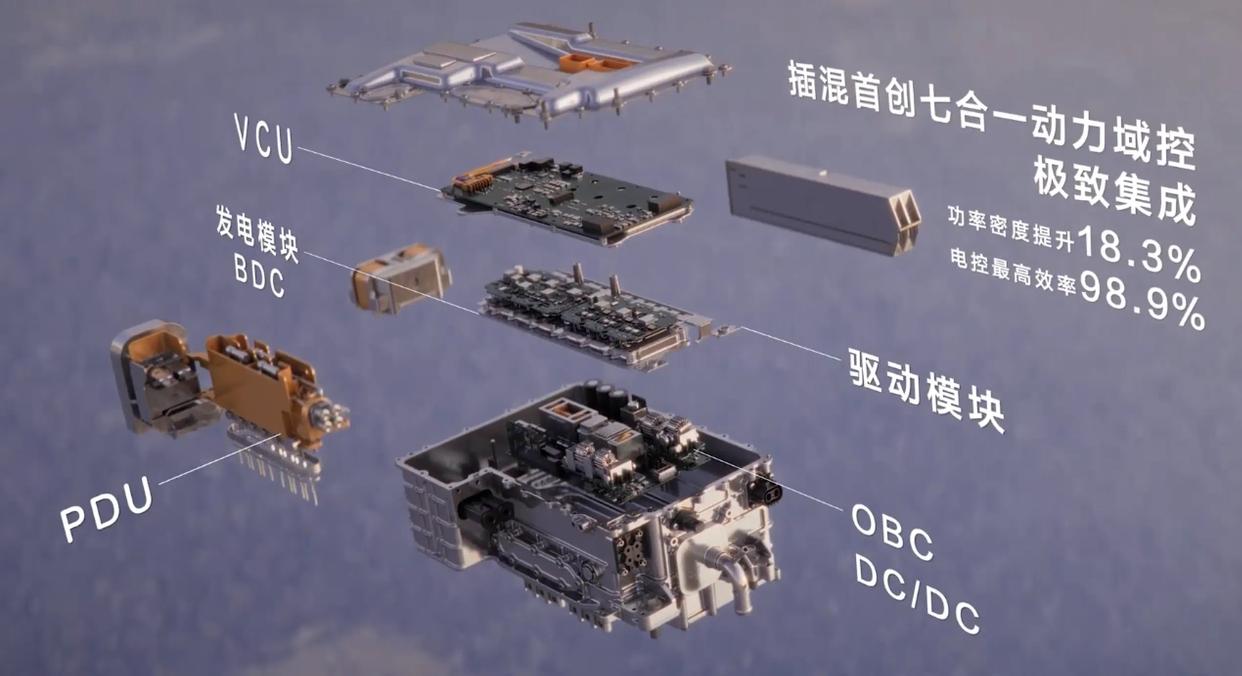 在電機控制器方面,比亞迪第五代DM技術也進行了高度集成化。該系統內部擁有比亞迪自研芯片和冷卻系統在內的7大部件,芯片算力提升146%,電控最高效率可達98.9%,功率密度也提升了18.3%。