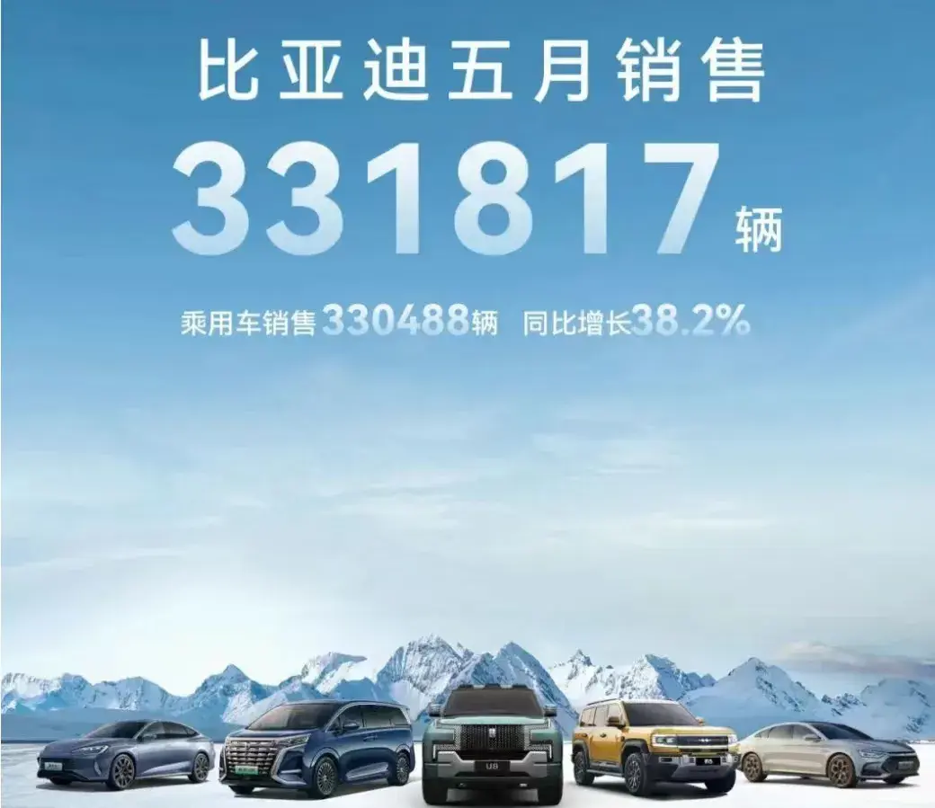 傳統新能源車企中,剛發布DM 5.0與兩款新車的比亞迪5月份銷量再次開大,僅乘用車銷量就達到了330488輛,同比增長38.2%,今年1-5月的累計銷量已達1266934輛。多數人認為,以比亞迪當前的勢頭,破400萬的年銷量不成問題。