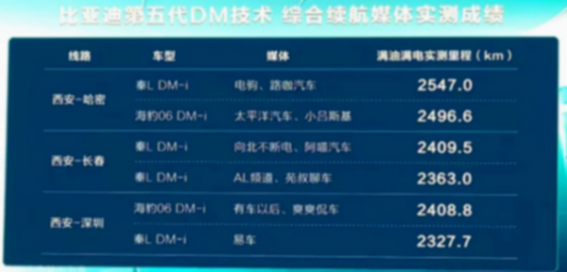 官方在發布會上公布的數據:秦L 在NEDC工況下,發動機熱效率46.06%,百公里虧點油耗2.9L,滿油滿電續航為2100km。大家也許對此數據表示懷疑,認為不可能做到。但是比亞迪邀請媒體的實際測試數據更高,公布的三條路線中,最低續航也高達2327.7km,最高續航達到2547km。在發布會上,官方也公布了這個成績,全部超過2300km,最高超過2500km。