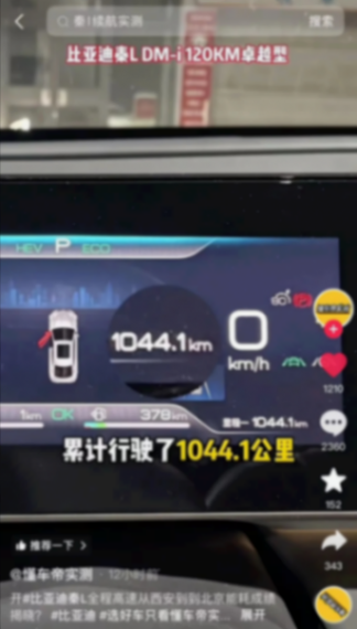 對于比亞迪秦L 的油耗和續航,大家都是不相信的,準備打假比亞迪,有媒體也做了測試。懂車帝官方進行的測試是百公里5.39L油耗,測試車輛為比亞迪秦L DM-i 120KM卓越型,從西安出發目的地北京,全程基本為高速路段。測試車輛表顯累計行駛1044.1km,剩余行程378km。