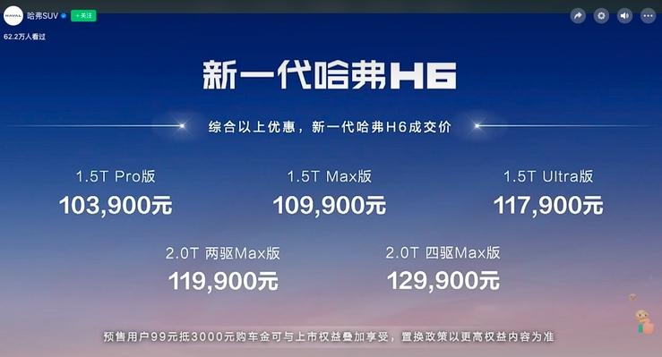 日前,全新一代哈弗H6正式上市,新車推出5款車型,官方指導價為11.79-14.39萬,綜合優惠后售價區間為10.39-12.99萬。