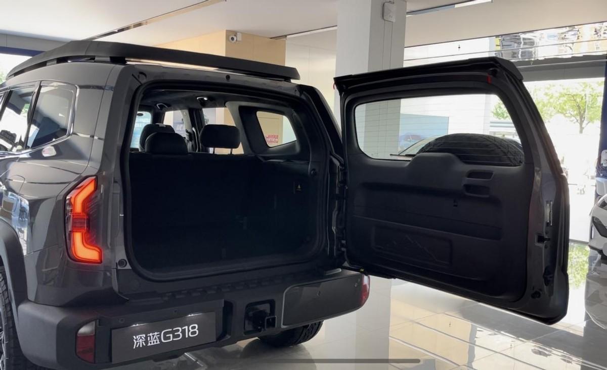 深藍(lán)G318在尾部也采用小書(shū)包的設(shè)計(jì),它并沒(méi)有套輪胎外殼,所以尾部看上去更有一種越野老炮的氣質(zhì)。在輪胎的下方,它原廠自帶拖拽口,擁有1.6噸的拖拽資質(zhì),拉一個(gè)房車或者2個(gè)摩托車沒(méi)有問(wèn)題的,這也省去了用戶后期加裝的煩惱了。