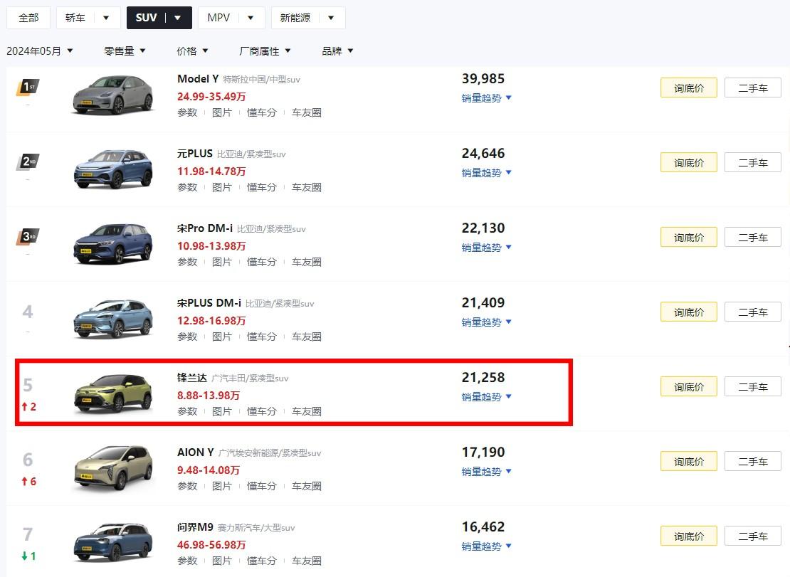 在5月SUV銷量榜前7名中,鋒蘭達(dá)排名第五,屬合資銷量最好的SUV