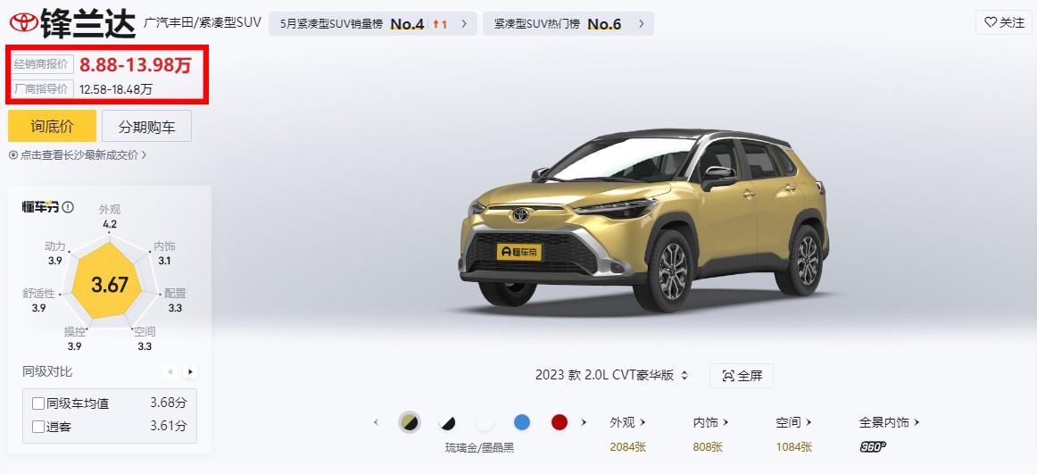 于是,豐田鋒蘭達(dá)這款車就在終端出現(xiàn)了3.7萬(wàn)元起步的優(yōu)惠降幅。換算下來,原先12.58萬(wàn)的最低配,現(xiàn)在優(yōu)惠完之后等于說8.88萬(wàn)就能提裸車,這性價(jià)比放如今的合資緊湊型SUV汽車市場(chǎng)里,那絕對(duì)也可以說是沒誰(shuí)了吧。