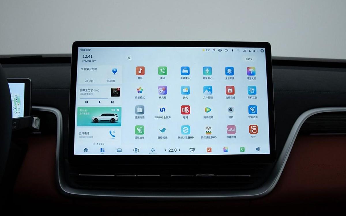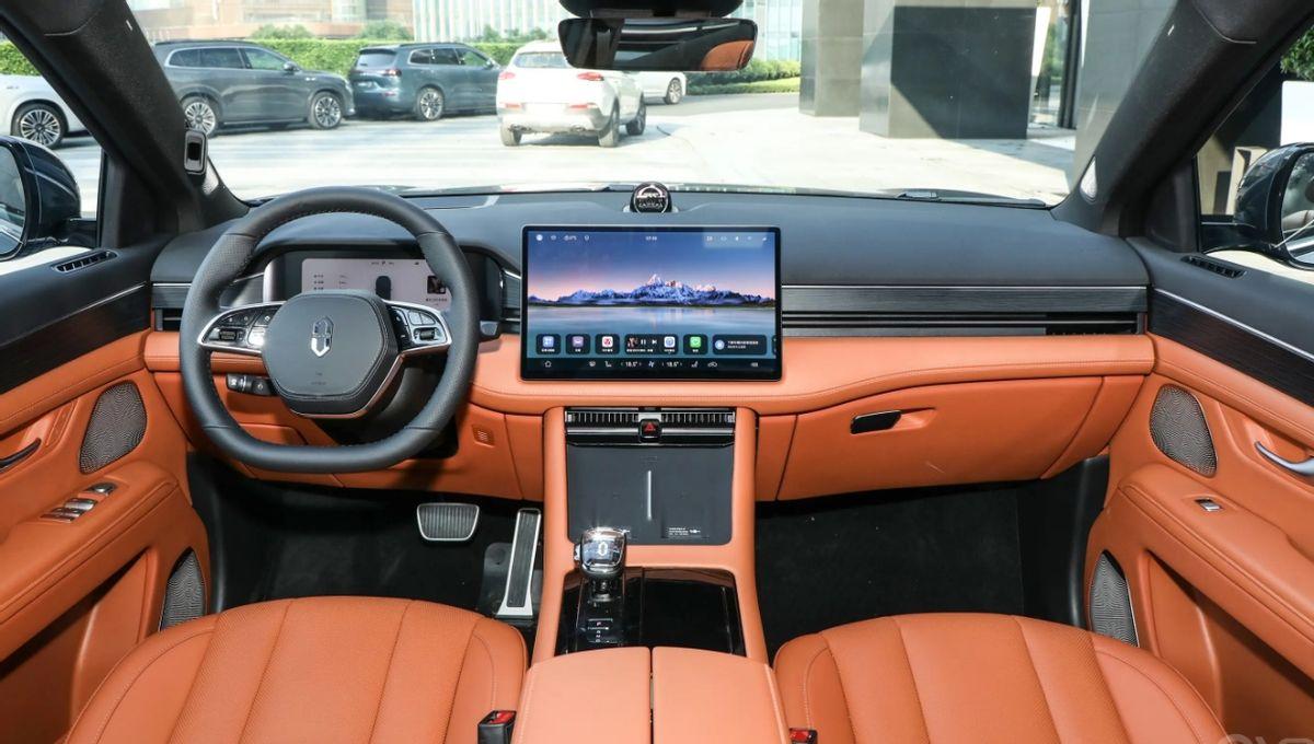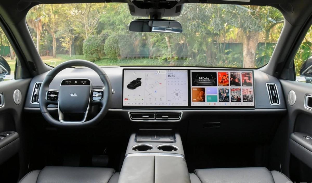 進入車內,eπ008的內飾設計很簡約,目之所及的地方我們能看到一塊懸浮式的儀表盤和一塊大尺寸的懸浮式中控屏,同時它還有著大量的皮革包裹,風格屬實也是和理想車型有那么一點相似的。