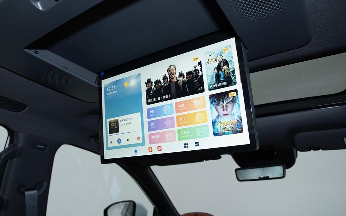 配置上,eπ008提供流媒體后視鏡、雙層夾膠隔音玻璃、50W無線快充、20揚聲器的品牌音響和64色氛圍燈,而后排則是配備了一塊15.6英寸的吸頂屏,這塊屏幕可播放視頻,也可以K歌,帶娃日常出游娛樂設備也有了。