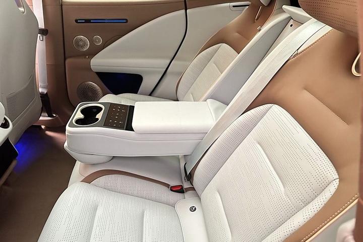 阿維塔07的后排同樣不簡單,混搭的皮質面料看起來質感出色,中間的靠背拉下來還有控制面板,可以控制靠背角度、副駕前后移動、遮陽簾、座椅加熱/通風等功能,配置水平足以看齊豪華品牌車型。此外,后排地臺依然為純平,車門上還有大小不一的3個喇叭,預計高配車型依然可以提供25揚聲器的英國之寶音響系統。