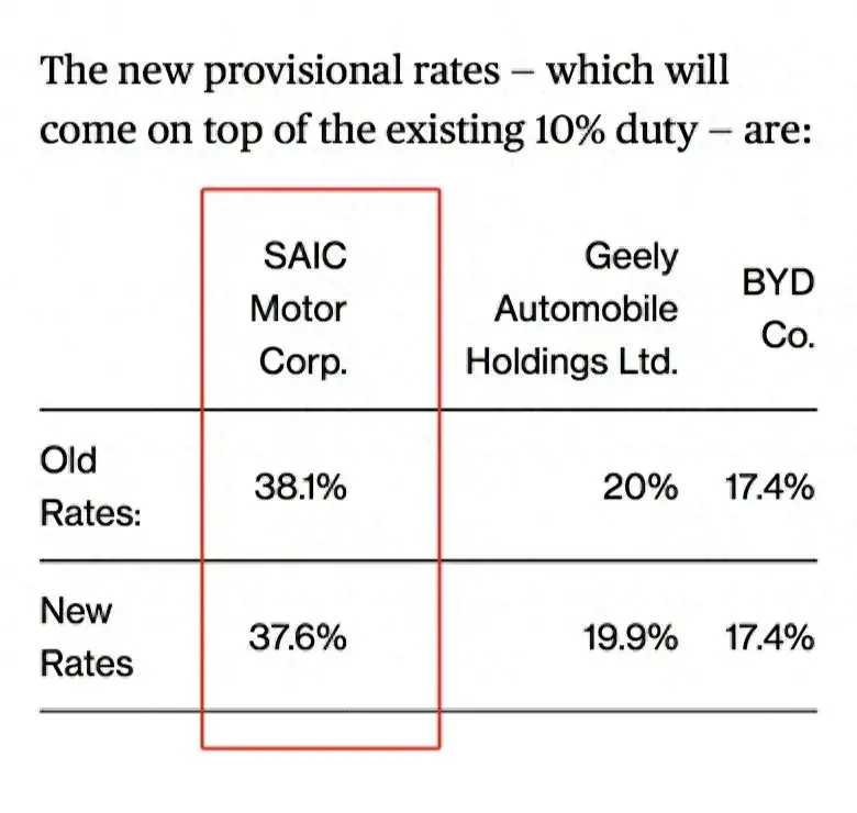 據(jù)6月26日彭博社報道,歐盟將微調(diào)針對中國電動車的臨時反補(bǔ)貼稅。上汽關(guān)稅從38.1%降到37.6%,吉利則從20%降到19.9%。比亞迪17.4%的稅率則維持不變。