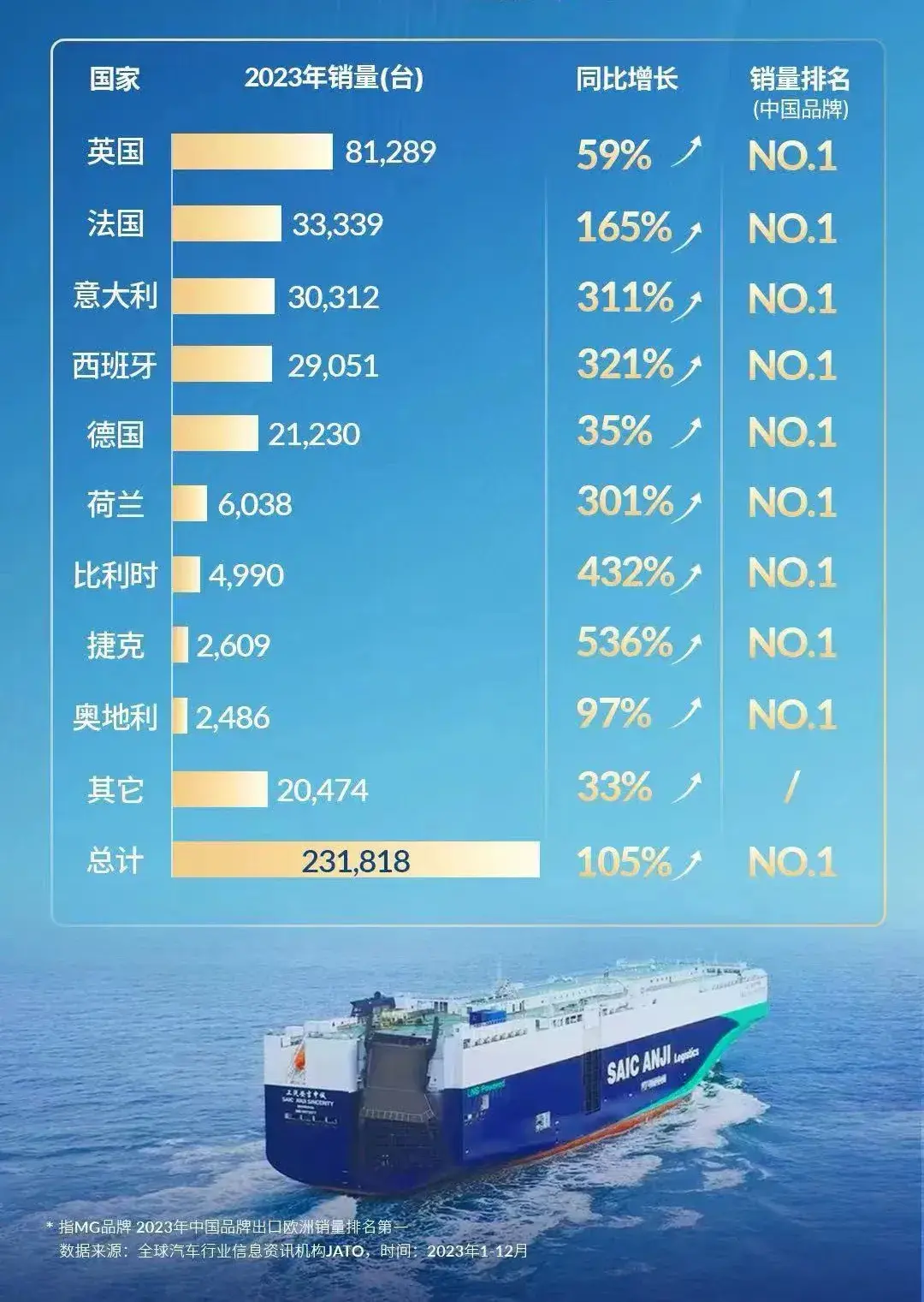 除了總量大外,MG品牌在英法意西德等9個歐洲國家,均拿下了國產(chǎn)品牌銷量第一的成績。