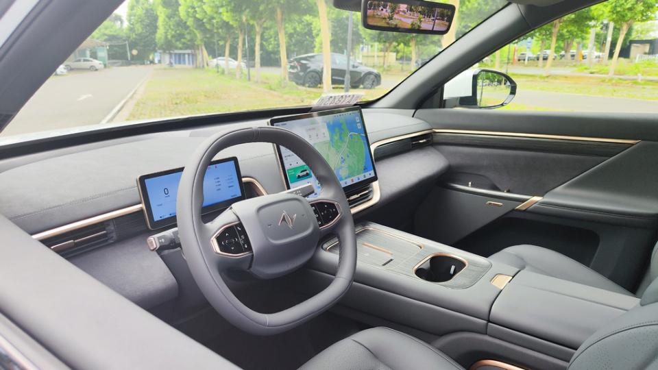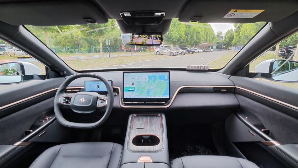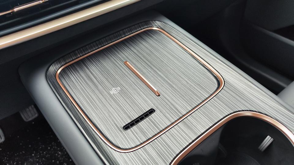 15.6英寸的中控屏集中了很多功能按鍵,下方是空調出風口。搭載高通驍龍8155芯片,車機的流暢度和應用生態與主流水平無異。頂部中央是9.2英寸的流媒體后視鏡,畫質細膩也不怎么反光。中控下方臺有50W手機無線快充面板,并且帶通風功能。
