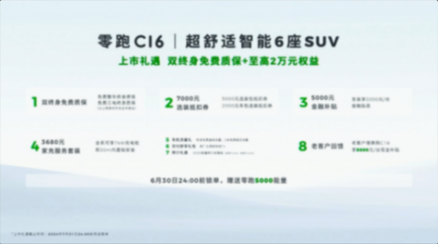 6月28日,零跑C16正式上市,售價15.58~18.58萬。這也是打破了目前市場上6座新能源SUV的價格,在大部分同類車型都在20萬奔上走的時候,零跑C16一舉把這個價格打到了最低15.58萬,同時還給到了雙終身免費質保+7000元選裝抵扣券權益等一系列購車權益,可以說這個價格本身,就相當具有競爭力。