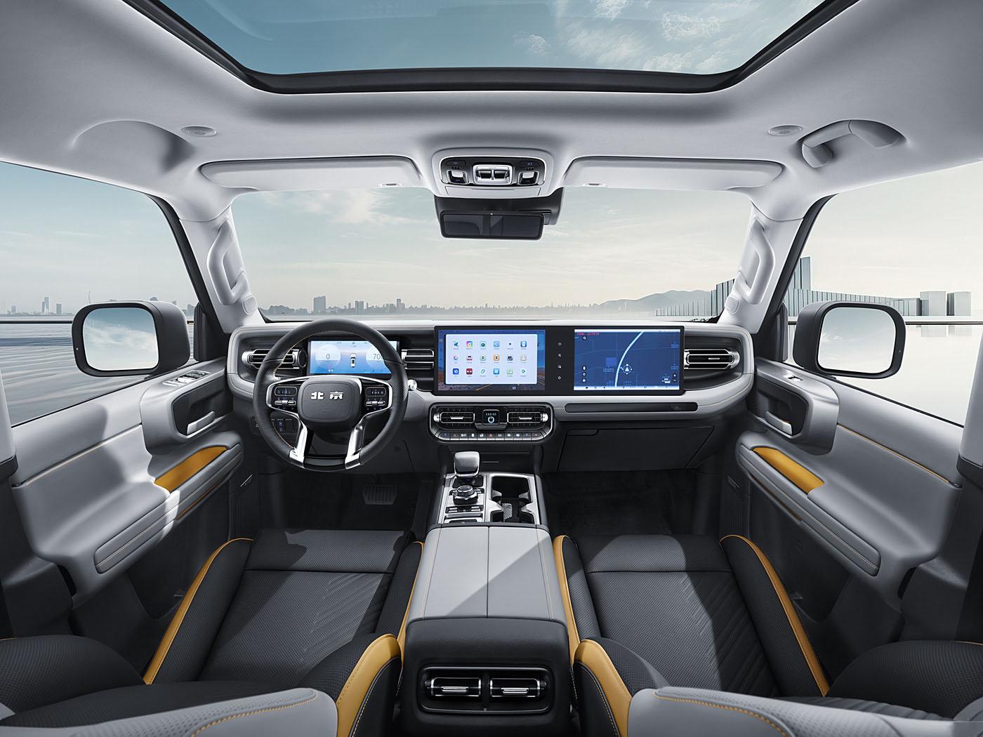 全新BJ40在內飾這一塊,可以說改頭換面,充分跟上了新能源大潮下的新風格。這款車除了搭載全液晶儀表之外,還搭載了大尺寸的雙聯屏,涵蓋中控屏和副駕駛娛樂屏,整體思路和理想、小鵬相似。同時空調區域保留了物理按鍵,所以全新BJ40的內飾設計,算是平衡了科技感和實用性。