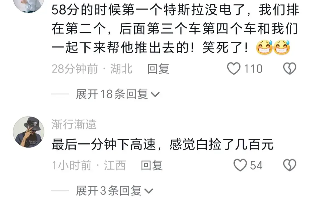 網友:58分的時候第一個新能源車沒電了,我們排在第二個,后面第三個車第四個車和我們一起下來幫他推出去的!