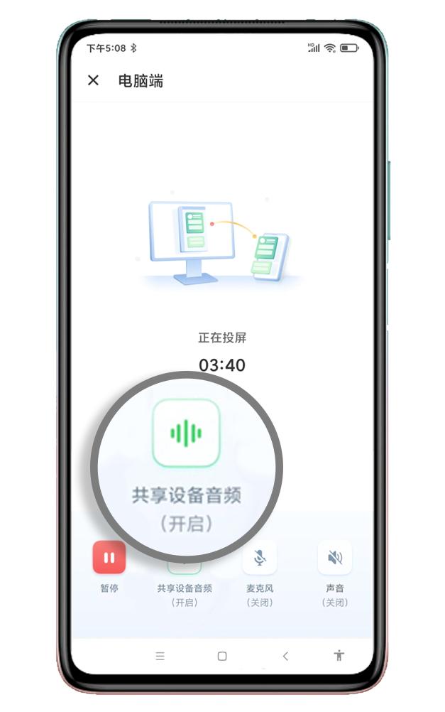第三步,將電腦上的投屏碼填寫到手機(jī),連接成功后,打開華為手機(jī)端AirDroid Cast里面的【共享設(shè)備音頻】按鈕。安卓10.0及以上版本的手機(jī)才有這個(gè)共享音頻功能。