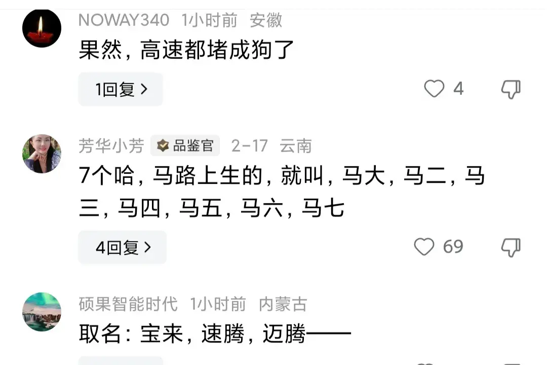 大家看到這條消息后都覺(jué)得很開(kāi)心,紛紛調(diào)侃這家主人升級(jí)了,大年初八就有了狗外孫,還是屬龍的,讓他們趕緊給壓歲錢;也有人調(diào)侃說(shuō)這家主人要在高速上給狗子照顧月子了。