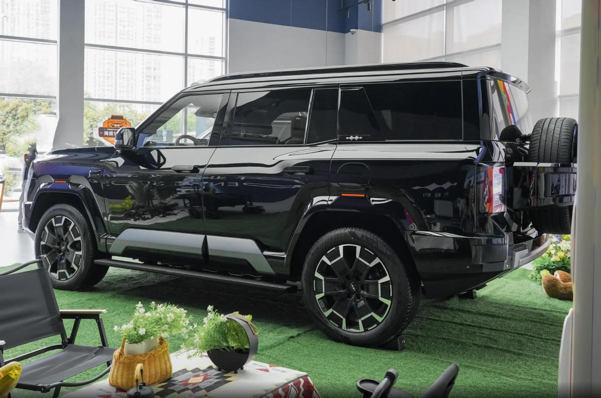方程豹豹8的車尾則同樣充滿了硬派SUV的設計元素,尾窗采用了平直化的設計,并且與熏黑的尾柱形成了連通式的效果,后尾門采用了側開方式,并在中部配有外掛式的備胎,粗壯的支架呈現出較強的力量感,而在后包圍區域,單獨的外凸杠體造型厚重,呼應車頭的上揚包覆也兼顧了尾部的離去角表現。