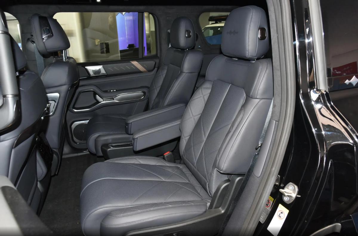 進入車內,方程豹豹8保持了家族化的座艙設計,中控臺有著較為厚重的臺面區域,并與中央扶手位置形成了T型的功能分區,臺面及門板區域均采用軟性皮質面料包覆,接合區域帶有規整的縫線處理,而在交互功能方面,前排配備了液晶儀表屏、副駕娛樂屏及懸浮中控屏,扶手區域采用了可升降的換擋把手設置,并且特意保留了豐富的實體按鍵,這也符合硬派SUV的固有元素。