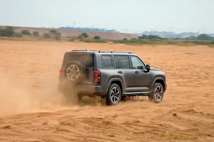 車輛原廠配備19英寸輪轂,搭配錦湖Crugen HP71輪胎,主要還是偏向于城市路面的駕駛,但盡管是原廠公路胎也不需要額外的放低胎壓,打開沙地模式,只要選擇好路線,應付河床干枯后留下的河沙路面都沒有太大問題,想炫技的話在沙地里漂移也不會出現四驅過熱的情況。