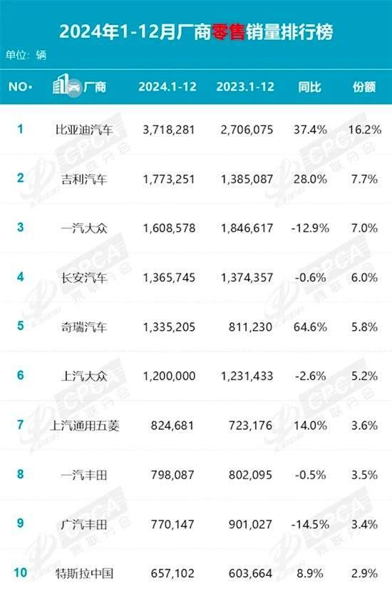 2024年車(chē)企銷(xiāo)量排行榜出爐:奇瑞擠進(jìn)前五,特斯拉只能排第十